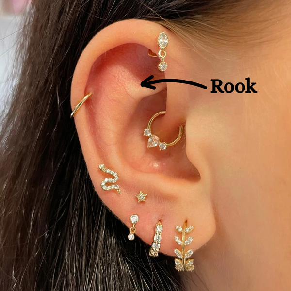 Le piercing hélix, discret sur le cartilage supérieur, le piercing tragus, subtil à l'avant du canal auditif, le piercing conch, original au centre, le piercing daith, esthétique dans le pli interne, et le piercing rook, sophistiqué dans le pli supérieur.